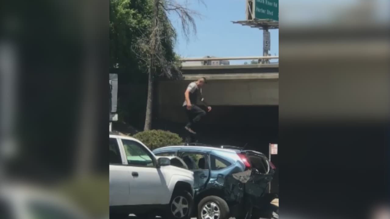 Choca su auto contra otro y después salta sobre él, todo bajo los efectos de las drogas