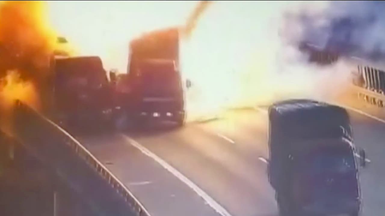 Como una bola de fuego, dos vehículos arden en llamas tras chocar en China