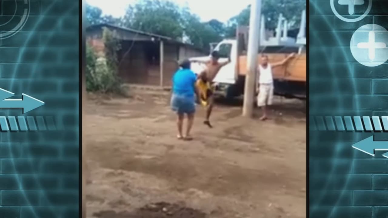 Estos dos vecinos de Nicaragua estaban discutiendo cuando, sin previo aviso, el joven propina una brutal patada a la señora, quien cae al suelo y llora por el dolor. Al parecer, la víctima sufre una discapacidad.