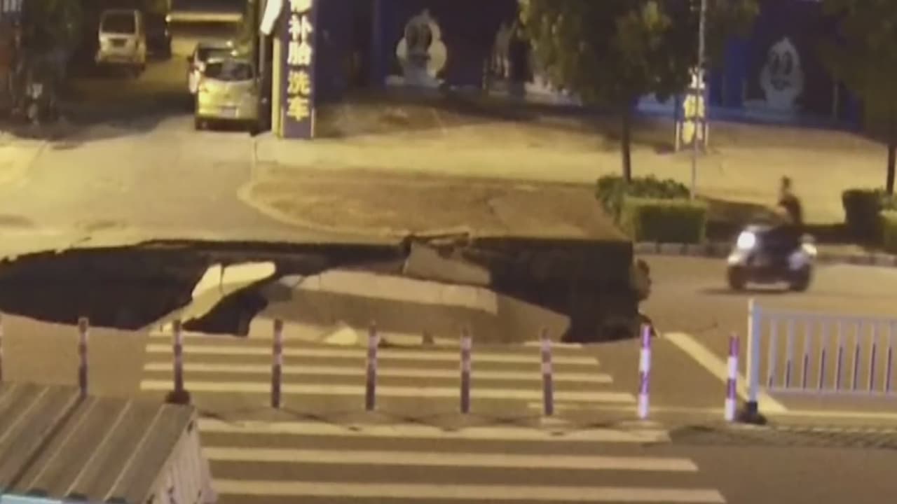 Conductor cae con su bici eléctrica en un enorme socavón que se abrió en el asfalto