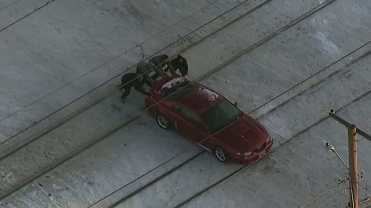 El auto quedó atascado sobre las vías de tren que estaban cubiertas por la nieve. Gracias a la ayuda de unos buenos samaritanos que lo empujaron, el chofer consiguió sacar el vehículo de las líneas y salvó su vida y su auto.