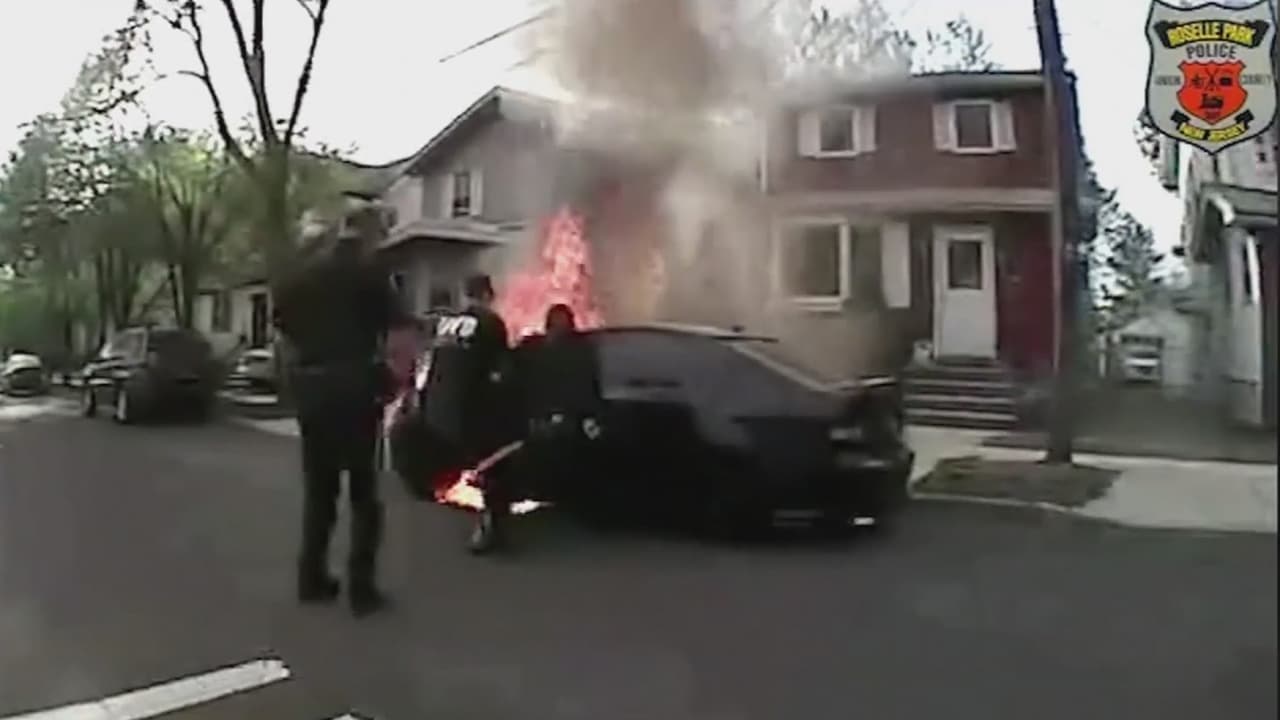 Los agentes de policía rompieron los cristales del auto para poder sacar al chofer. Pero las llamas consumían el vehículo y el rescate casi les cuesta la vida a los oficiales.