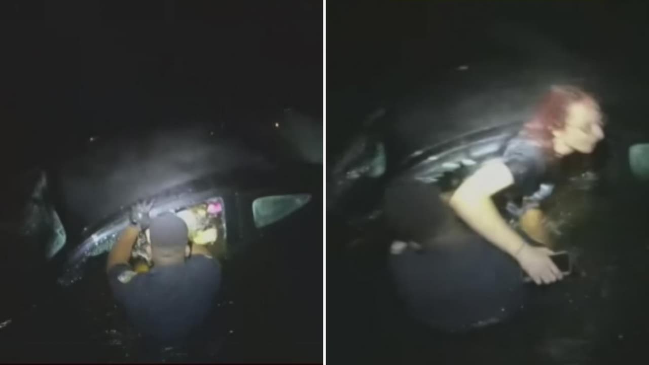 La mujer estaba adentro de su auto mientras este hundía rápidamente y no podía abrir la puerta por la presión del agua. Unos policías llegaron a tiempo y lograron romper la ventana del vehículo y sacarla.