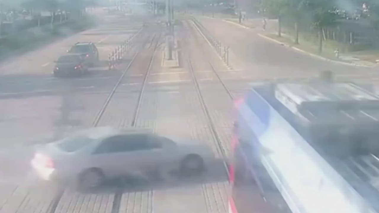 El momento en que un tren a toda velocidad parte un auto por la mitad