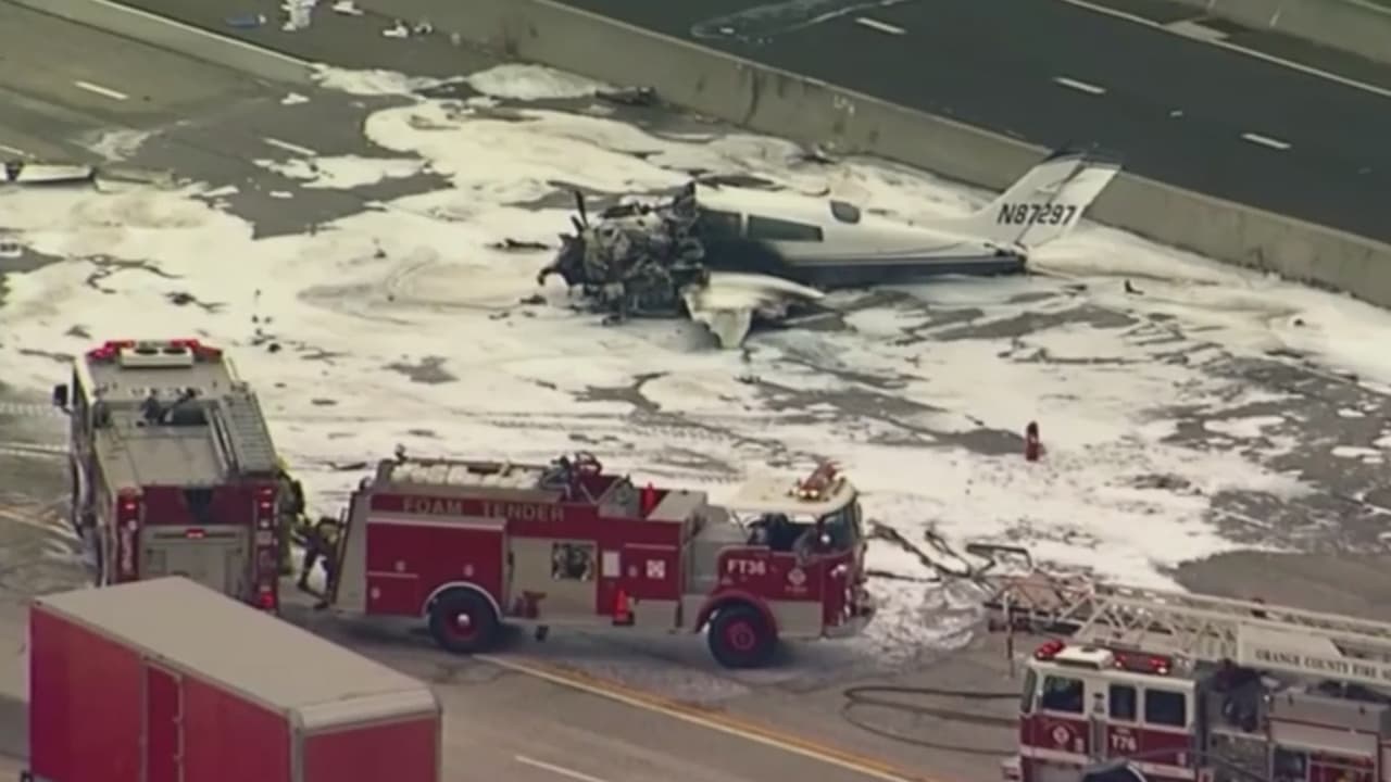 El momento en que una avioneta se estrella en plena autopista y estalla en llamas en California