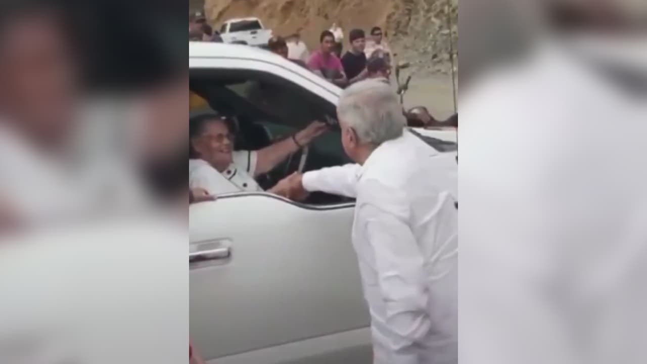 En medio de la crisis por coronavirus y el llamado de los expertos sobre el distanciamiento social para evitar contagios, el presidente Andrés Manuel López Obrador bajó de su camioneta para estrechar la mano de María Consuelo Loera Pérez.