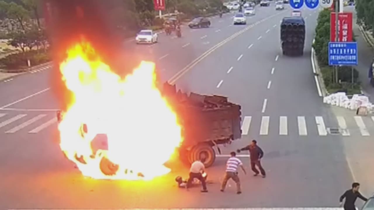 El motorizado chocó contra el tanque de gasolina de un camión, lo que provocó que se encendiera en llamas. El hombre presenta quemaduras severas y es tratado en un hospital de China.