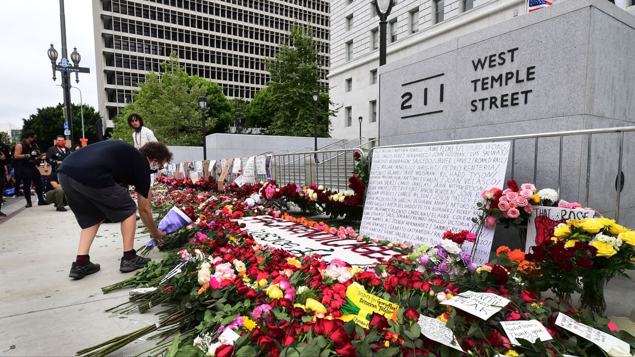 Durante las protestas no se han respetado las normas de distanciamiento social, pero muchos se las han arreglado para hacer escuchar su voz contra el racismo. Uno de estos ejemplos ocurrió en Los Ángeles, los manifestantes dejaron flores en memoria de George Floyd y lo hicieron poniendo en práctica la distancia social frente a la oficina de la policía de la ciudad.