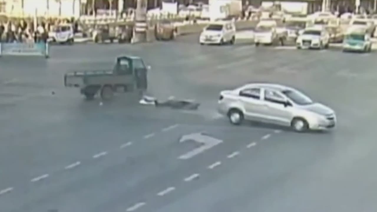 En imágenes: Una camioneta fue impactada en China y el conductor quedó tendido sobre la vía