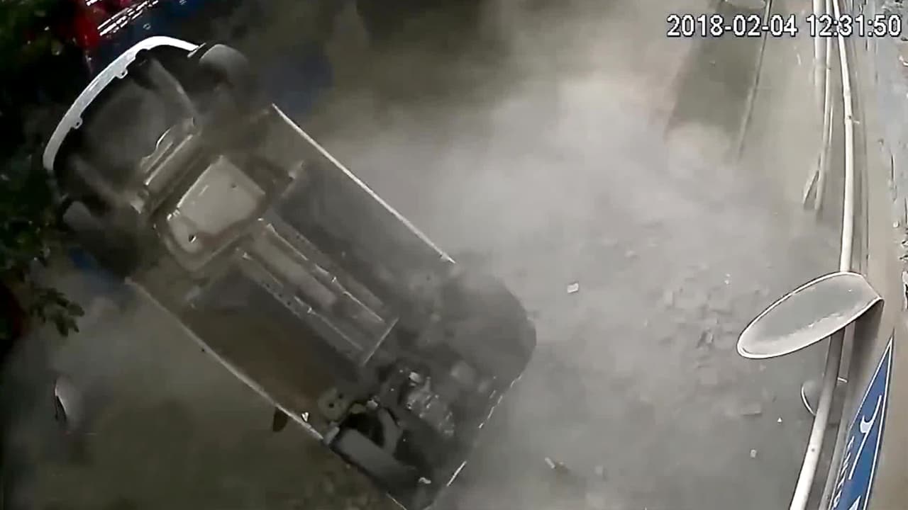 Auto se hizo pedazos al caer desde el segundo piso de un estacionamiento en China