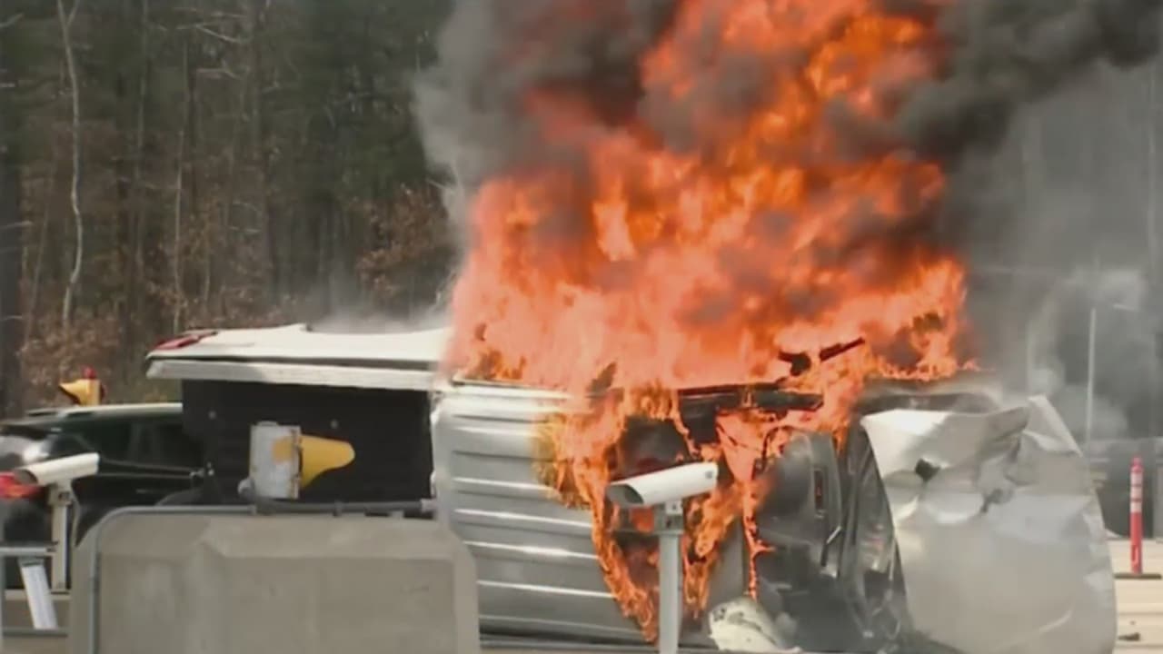 Camioneta termina envuelta en llamas tras chocar contra una estación de peaje