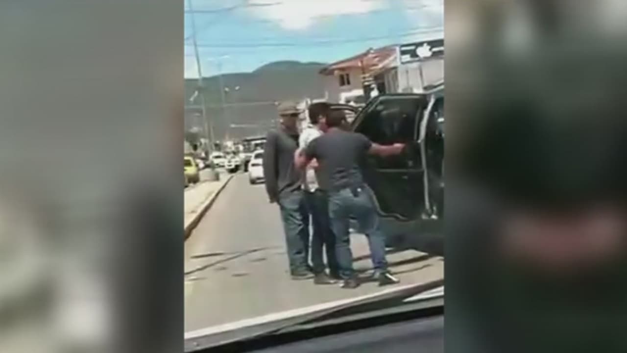 Dos hombres detienen una camioneta para lo que parece ser un secuestro en México