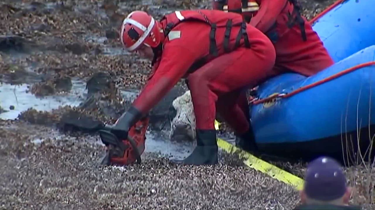 Con un hacha y una sierra, los socorristas en Carolina del Norte cortaron el hielo para poder liberar al animal.