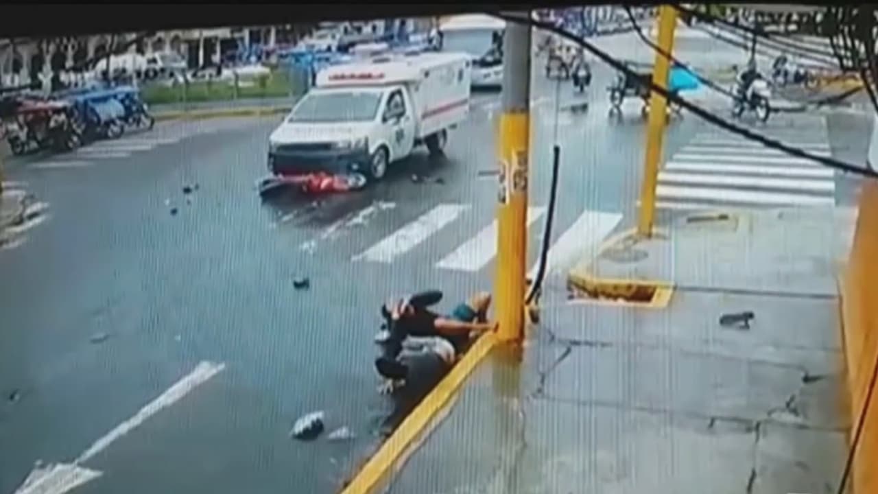 El momento en que motociclista y pasajero vuelan por el aire tras ser impactados por una ambulancia