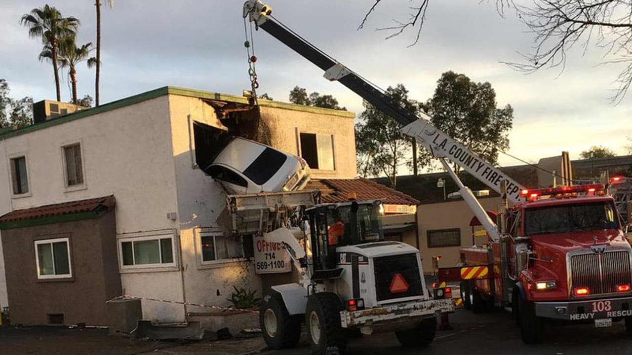 El momento exacto en que un auto sale volando y acaba incrustado en el segundo piso de un edificio