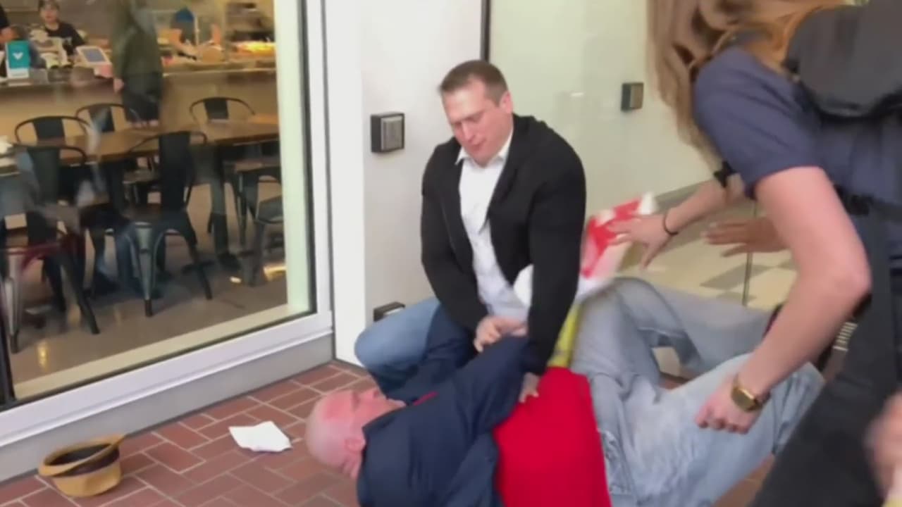Un hombre fue lanzado con furia al suelo cuando intentaba entrar al edificio de la empresa para presentar una queja durante la manifestación. Los empleados se quejan de los despidos en la compañía causados por reclamos de usuarios que ellos consideran injustos.