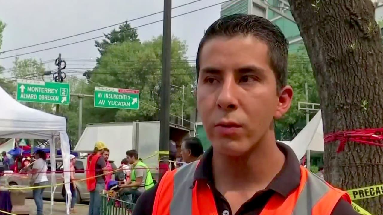 Familiar de un desaparecido en el terremoto entra en los escombros para buscar a su hermano