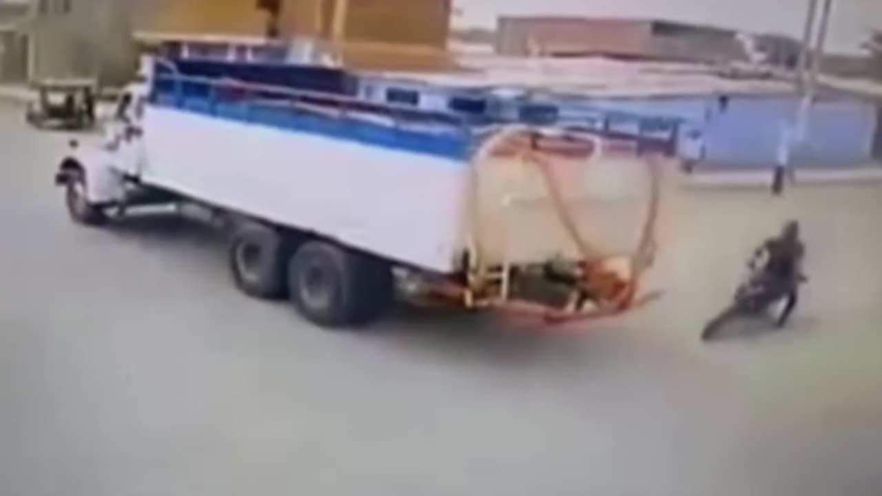 La maniobra de un motociclista para evitar chocar contra un camión en Perú