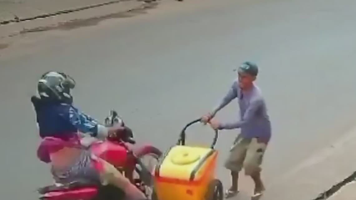 Una cámara de seguridad captó el momento en el que un motociclista pierde el control de su vehículo y se precipita contra un vendedor ambulante de helados que caminaba por una calle de Brasil. Tras el brutal choque, los dos hombres fueron trasladados a un hospital donde se confirmó que el vendedor había sufrido gracias lesiones en su cabeza.