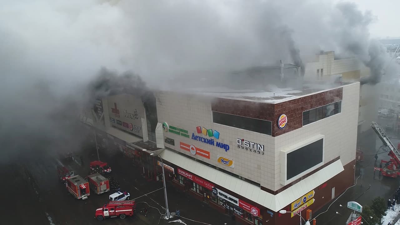 Una persona salta por la ventana para escapar de las llamas de un centro comercial en Rusia