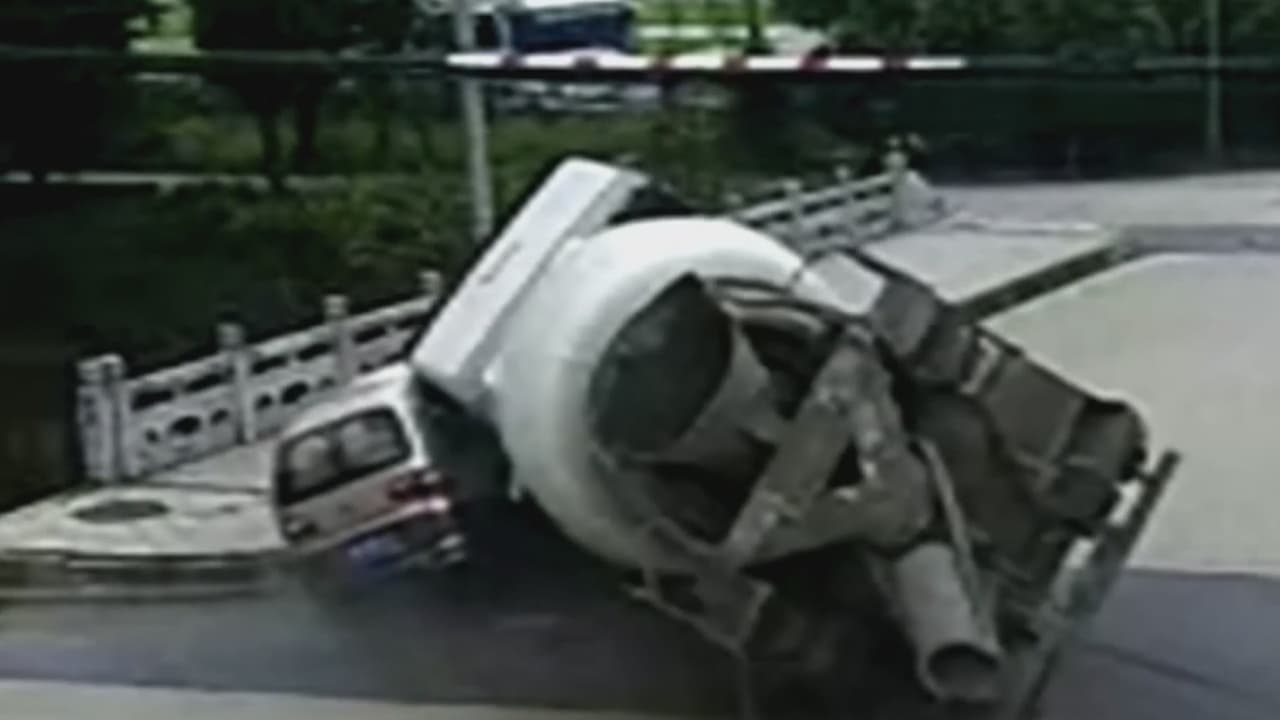 Tras el aparatoso impacto ocurrido en una calle de China, el chofer de la furgoneta sale caminando segundos después con algunas lesiones leves. El conductor del camión alega que hizo que se volcara a propósito para amortiguar el impacto.