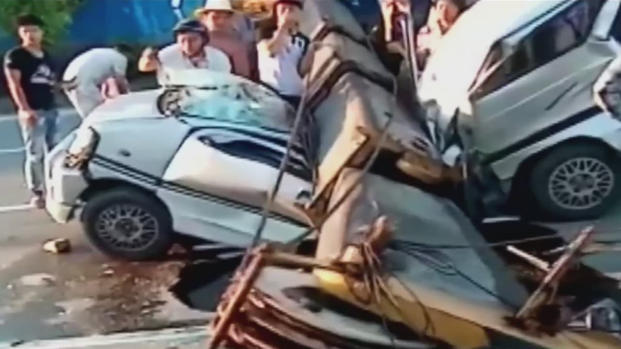 Enorme grúa parte en dos a microbús con 10 pasajeros a bordo