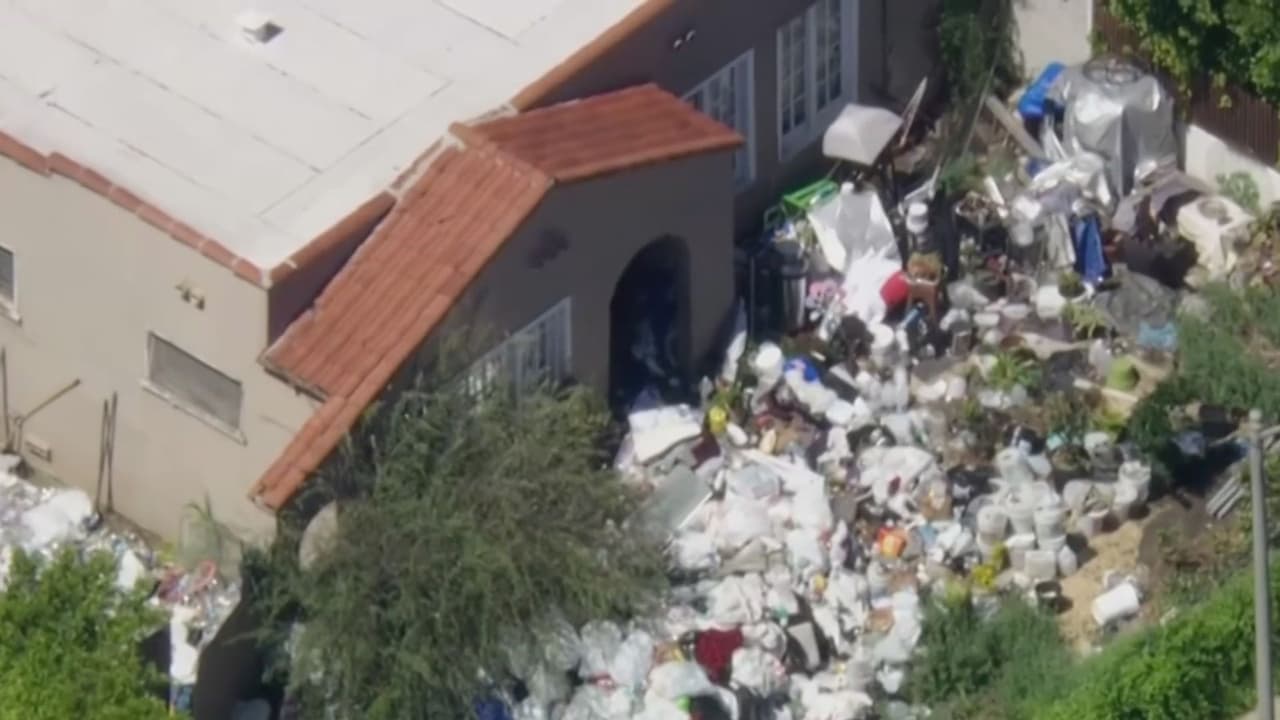 En medio de dos multimillonarias mansiones, en un lujoso vecindario de Los Ángeles, hay una casa a la que ni siquiera se le ve la puerta de entrada por la cantidad de basura que ha acumulado. Vecinos del área aseguran que hace 10 años no la limpian y su presunto dueño no da explicaciones de por qué no se deshace de la suciedad.