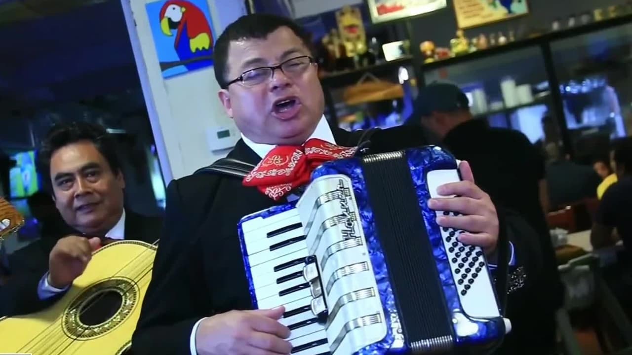 Con sus compañeros mexicanos recorre los bares para alegrar con música mexicana. Asegura que perdió la visión en su país tras someterse a una cirugía cuando tenía 20 años.