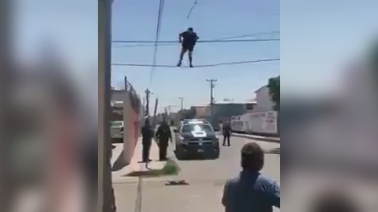 El sujeto caminó por los cables del tendido eléctrico para huir de las autoridades, como si fuera un superhéroe. Después de una huida de impacto acabó arrestado.