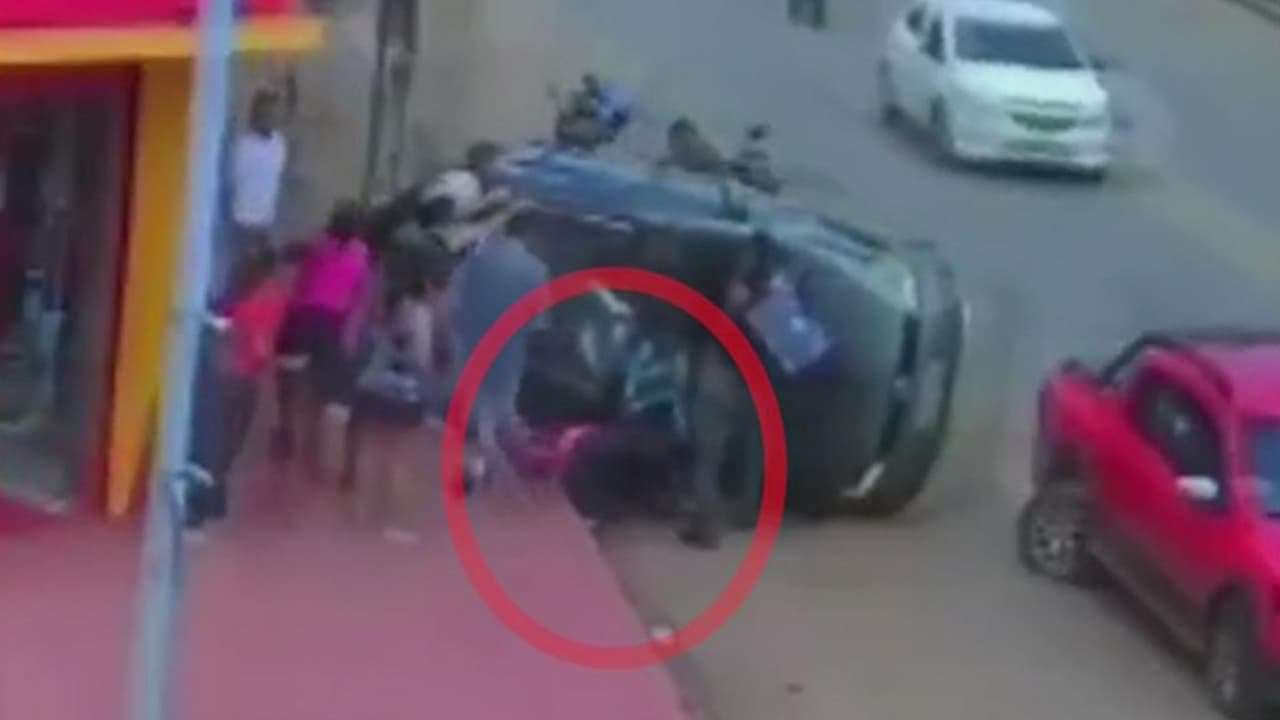 Una cámara de vigilancia grabó cómo el conductor pierde el control del vehículo, choca contra un auto estacionado y termina volcándose encima del hombre que estaba en su bicicleta en una calle de Porto Belo, Brasil.