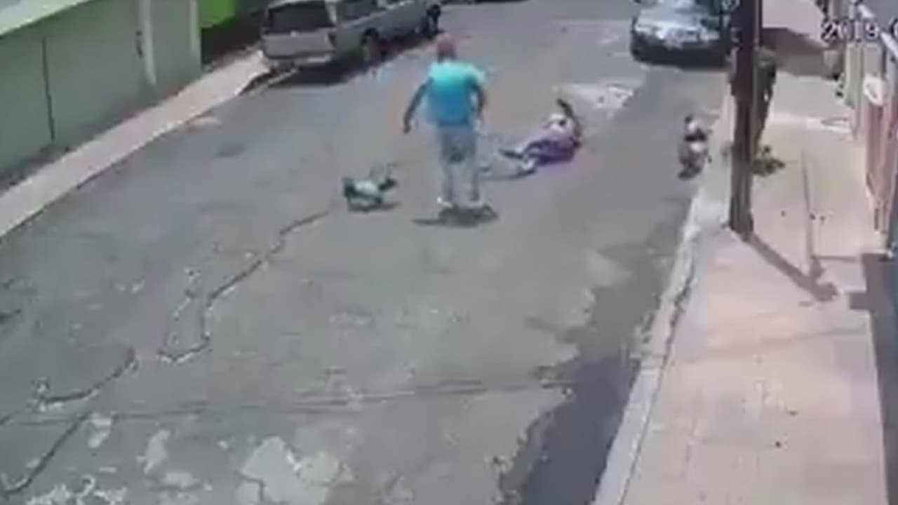 Guadalupe caminaba a su perro cuando otros tres perros se lanzan contra él. Mientras ella trataba de proteger al pequeño animal, un hombre sale de la nada y la empuja causando que cayera al piso.