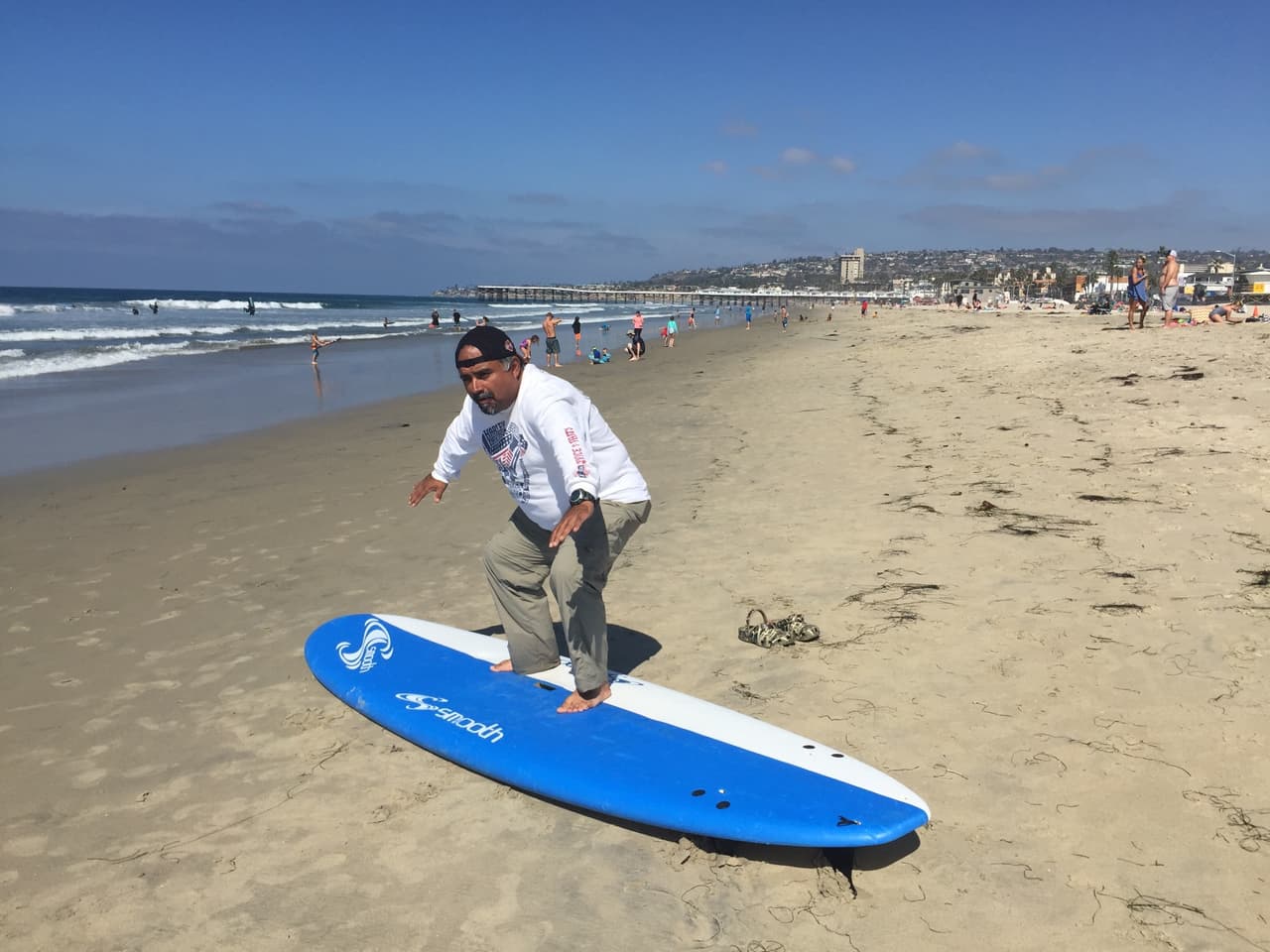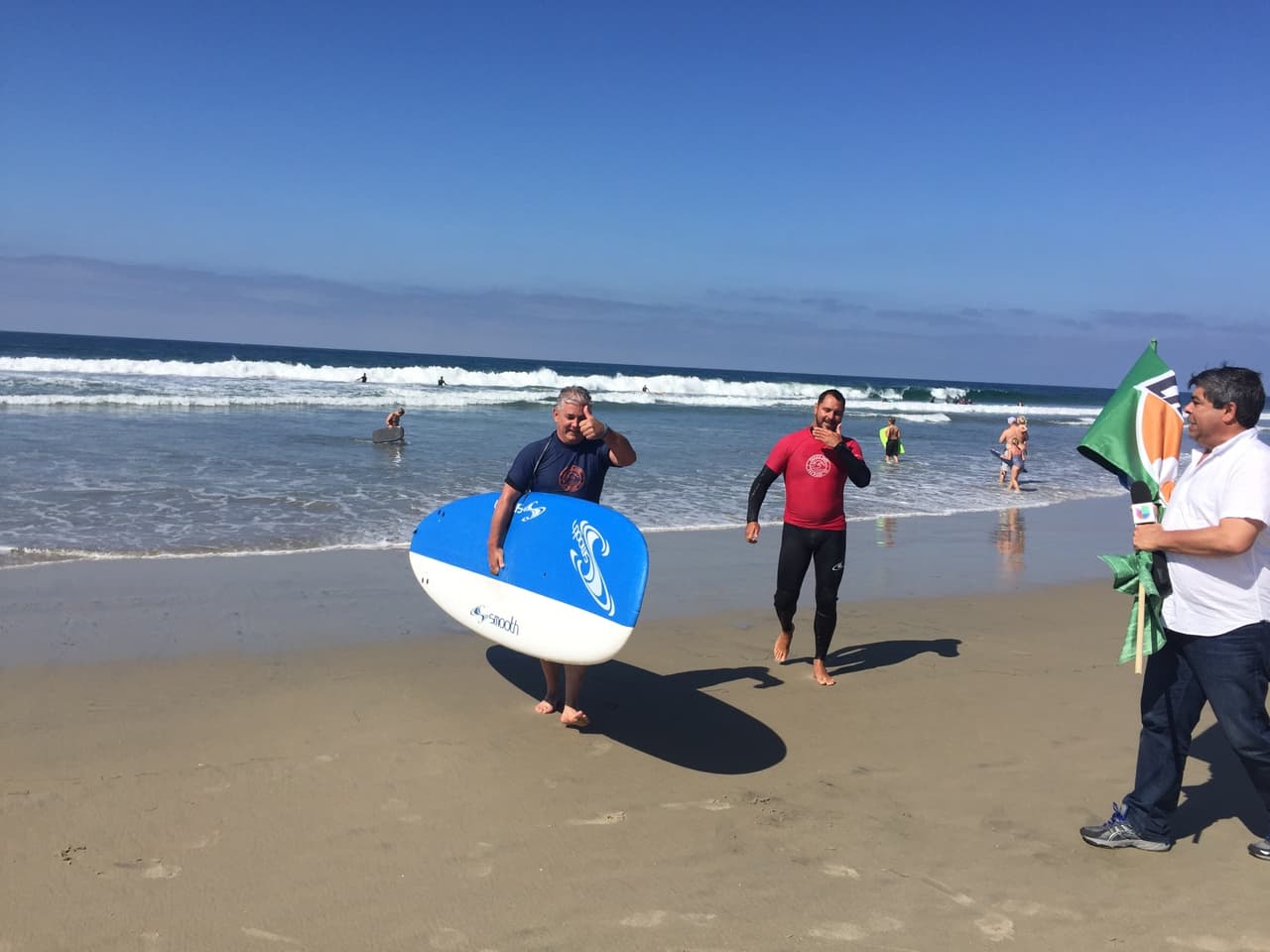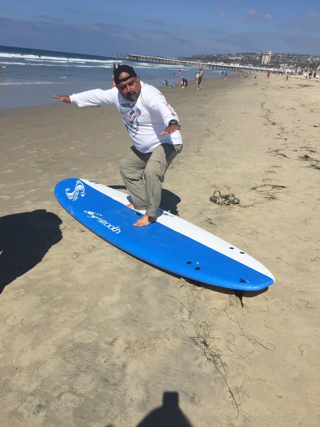 Después de practicar en la arena Ricardo Arambarri se aventuró a cabalgar las olas en las playas de la frontera, donde tras varios intentos logró pararse por lo menos 30 segundos en una tabla de surf.