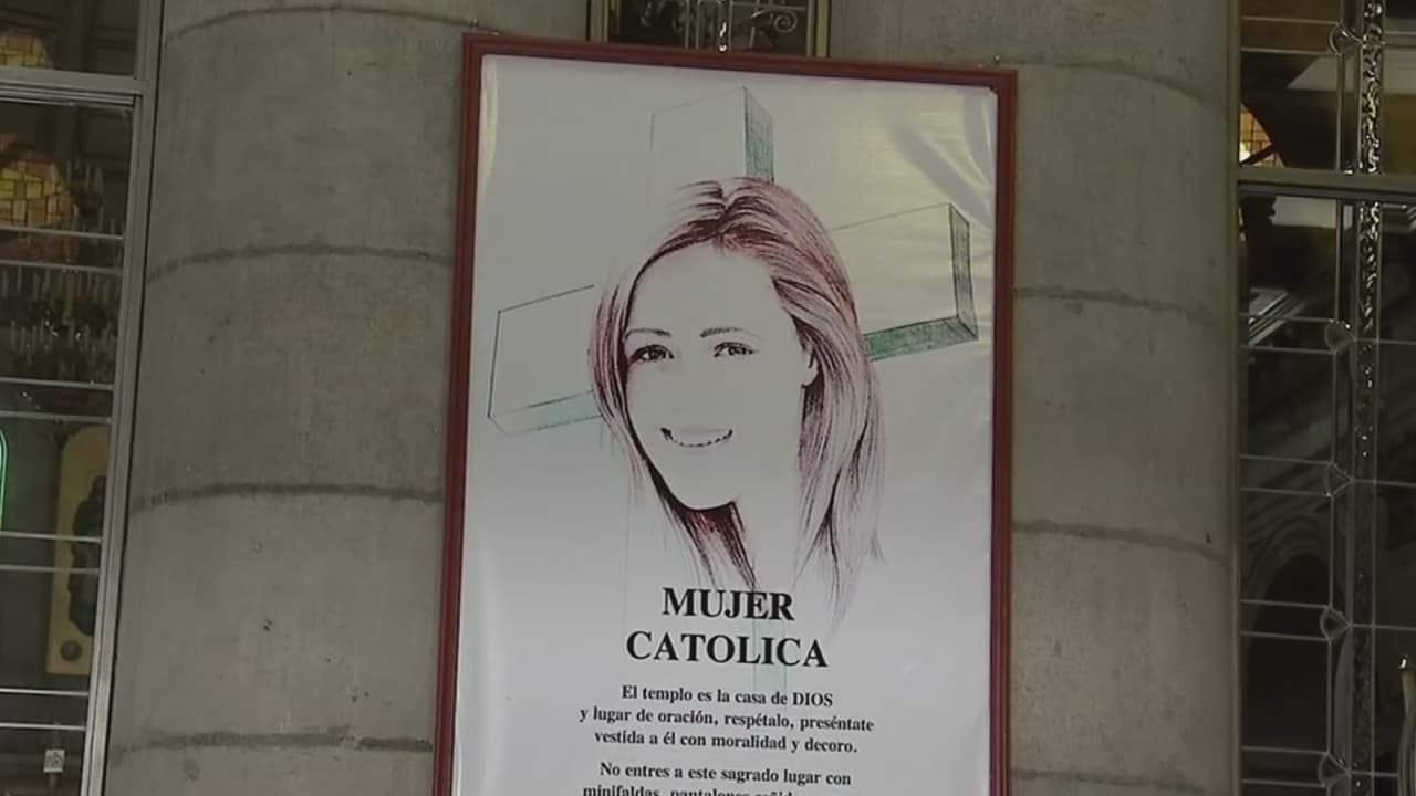 El letrero dicta un nuevo código de vestuario para que las mujeres que asisten al templo religioso no ofendan a Dios.