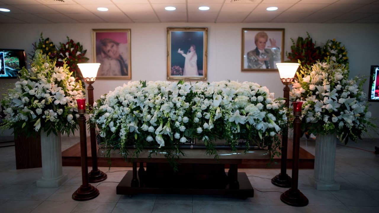 Los restos de Walter Mercado descansan en un féretro dorado cubierto de flores blancas