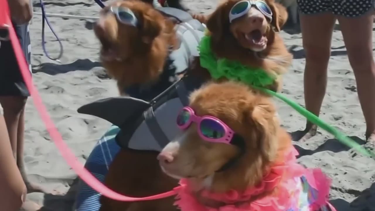 Los atrevidos canes mostraron sus habilidades haciendo equilibrio sobre las olas y también compitieron en un concurso de disfraces.