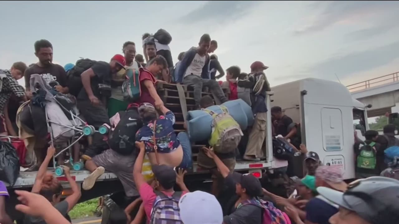 Los vehículos transitan abarrotados de migrantes a través de México. Agotados, niños y migrantes les suplicaron a los conductores que los dejaran subir en la parte trasera para poder llegar a la frontera con EEUU.