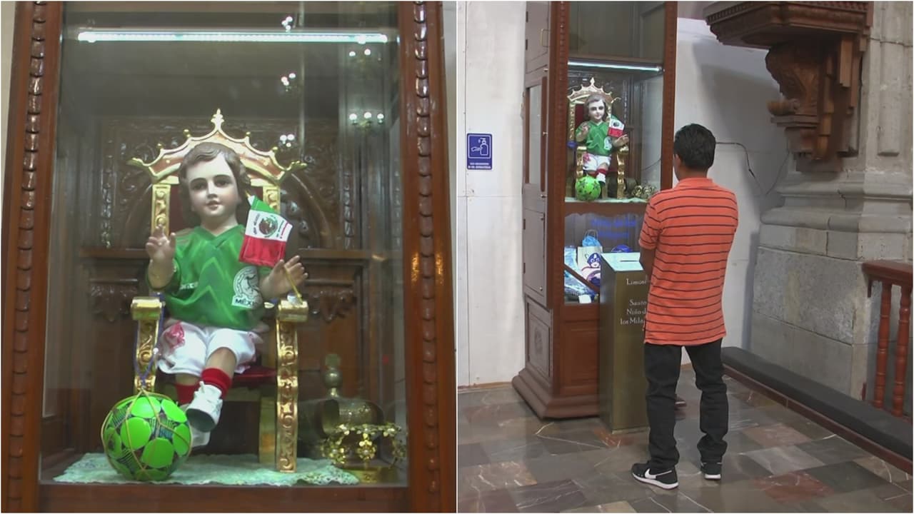Vestido con el uniforme tricolor, el Niño de los Milagros refuerza al equipo nacional desde su urna en una parroquia de Ciudad de México