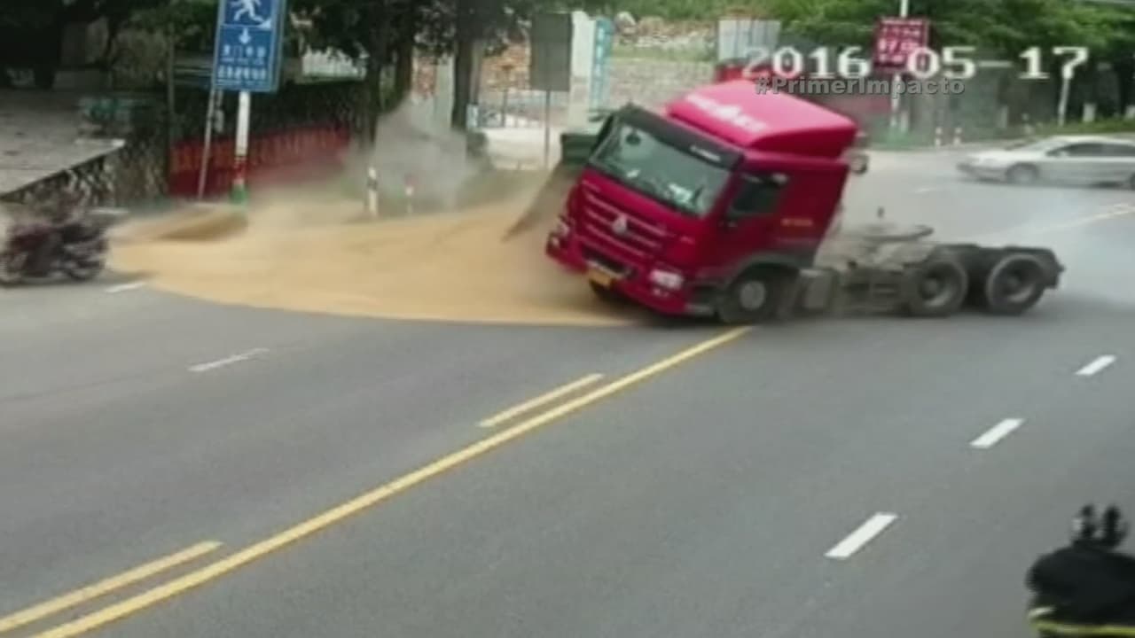 Afortunadamente el motociclista que transitaba por una calle en China cuando un gigantesco camión para evitar una colisión volcó toda su carga de arena, no resultó lesionado.