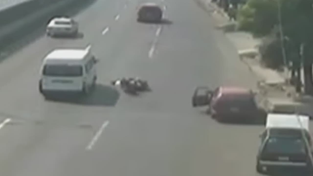 El hombre circulaba por una autopista en México, pero cayó al suelo cuando su motocicleta fue golpeada por la puerta de un auto que se abría en ese momento.