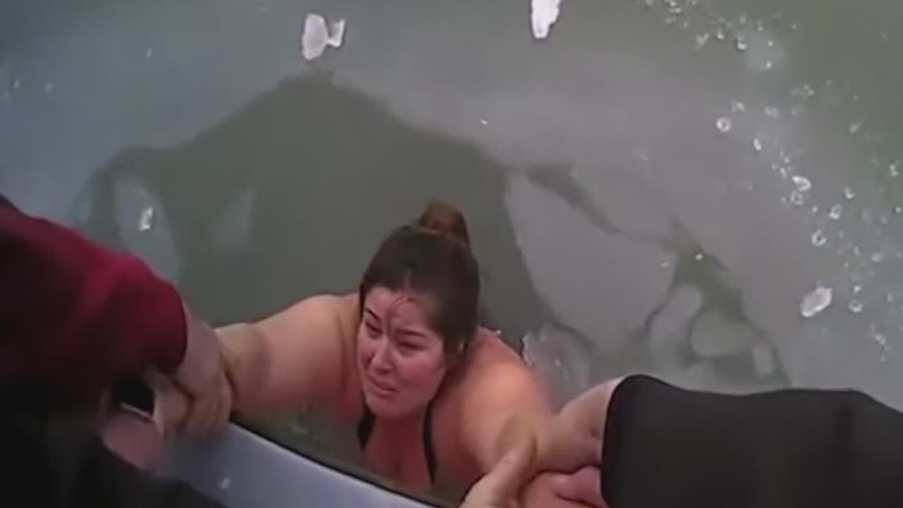 Mujer cae a las gélidas aguas de un lago y así fue su rescate