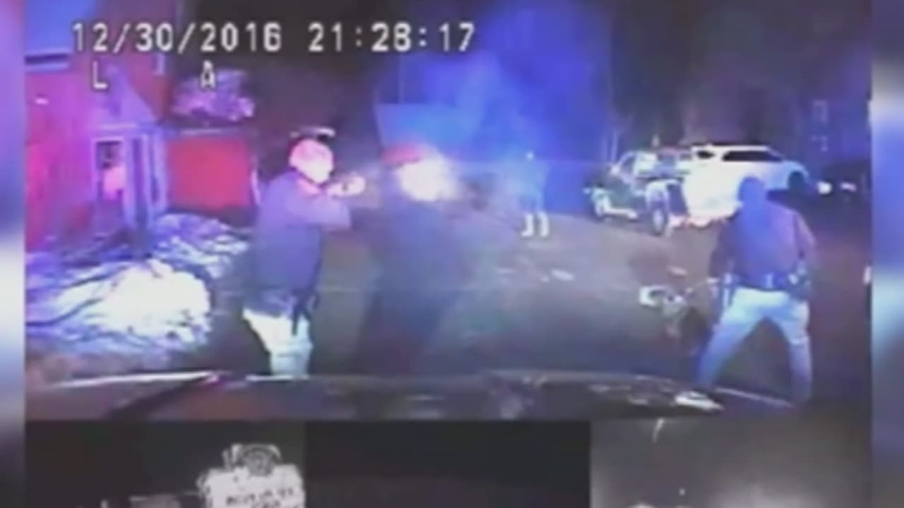 Varios policías perseguían al hombre, acusado de violencia doméstica. Cuando el fugitivo se bajó del coche, los agentes se dieron cuenta de que llevaba una cadena en la mano y le dispararon con una pistola eléctrica, pero él siguió en pie.