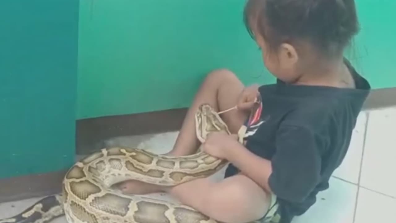 Niña de 3 años juega a ser enfermera con una serpiente pitón de más de 15 pies de longitud