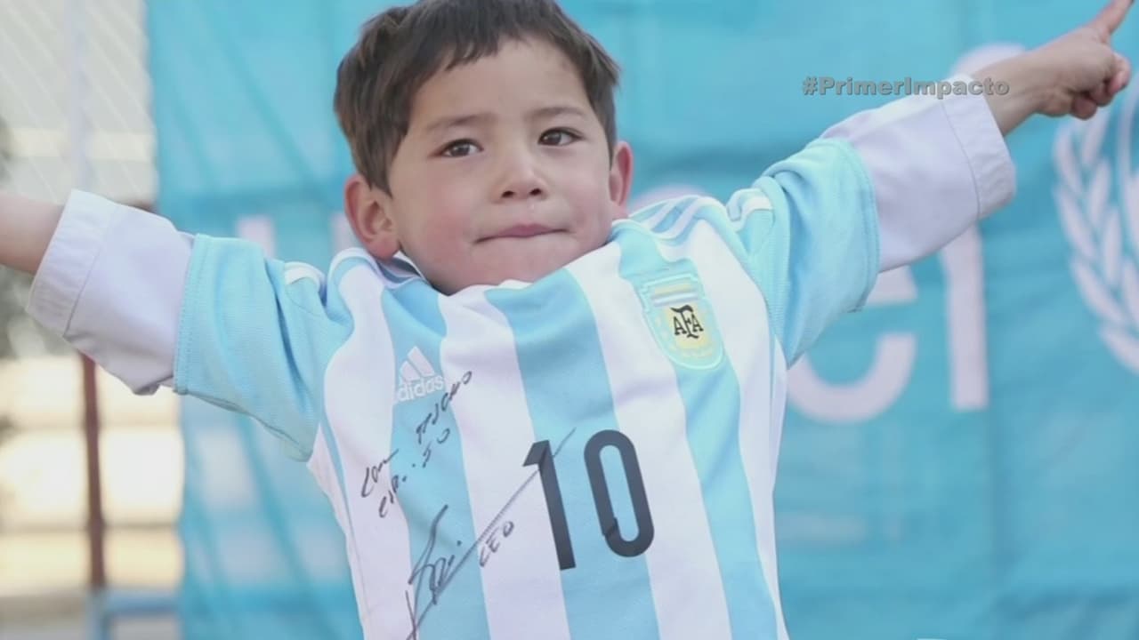 Niño de Afganistán recibe una camiseta firmada por Lionel Messi