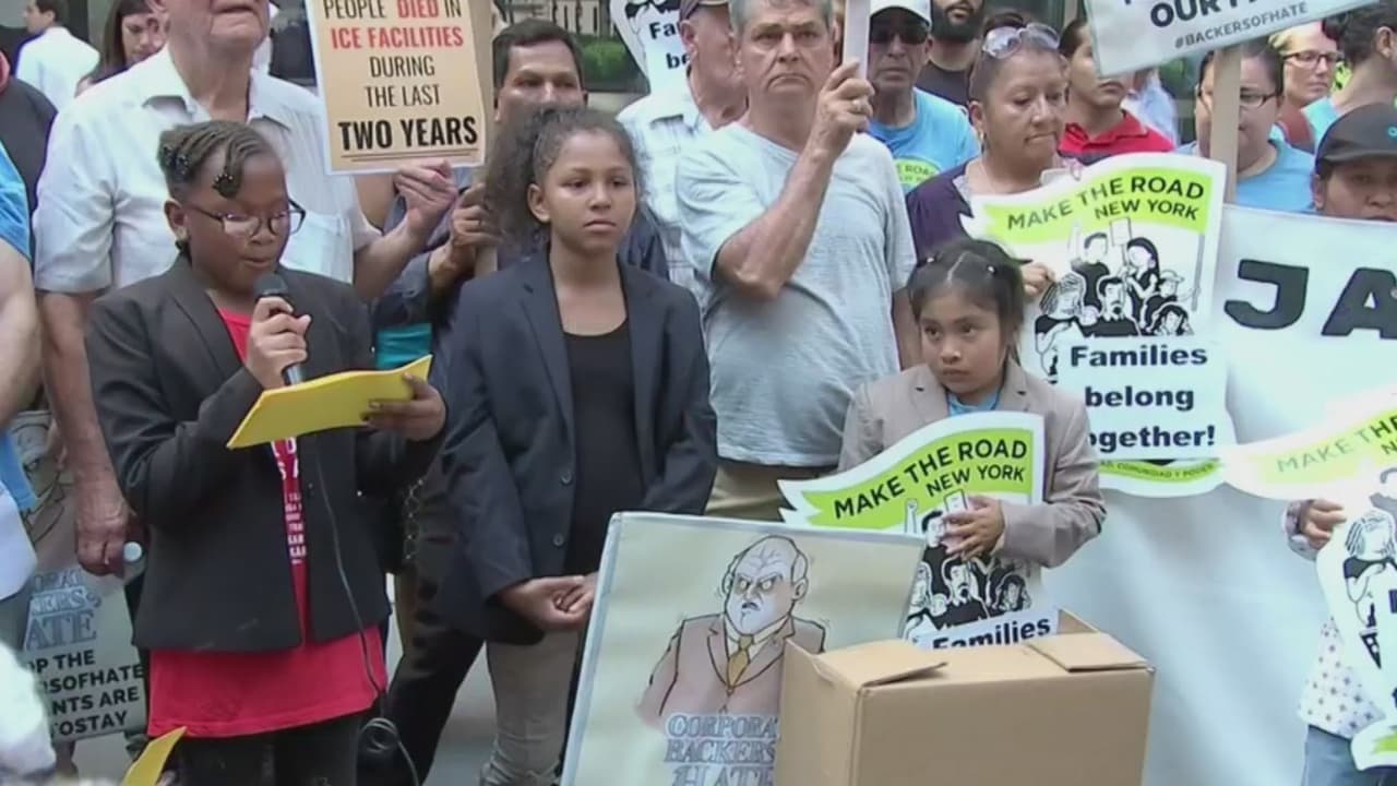 Niños protestan frente a banco de Nueva York contra inversiones de prisiones para inmigrantes