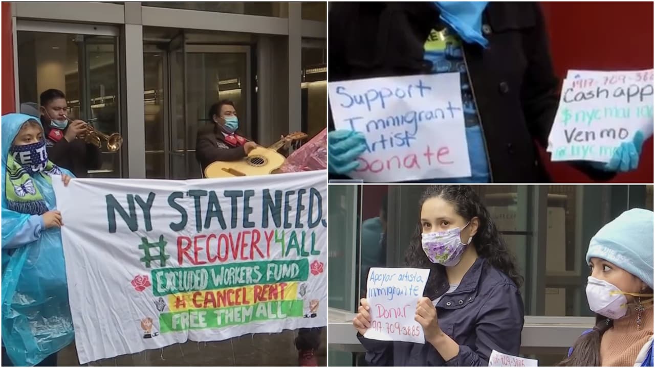 Manifestantes salieron a las calles del corazón de la ciudad de Nueva York para protestar por la falta de apoyo que han recibido los inmigrantes durante la crisis generado por el coronavirus. Piden ayuda para aplazar pagos de renta.