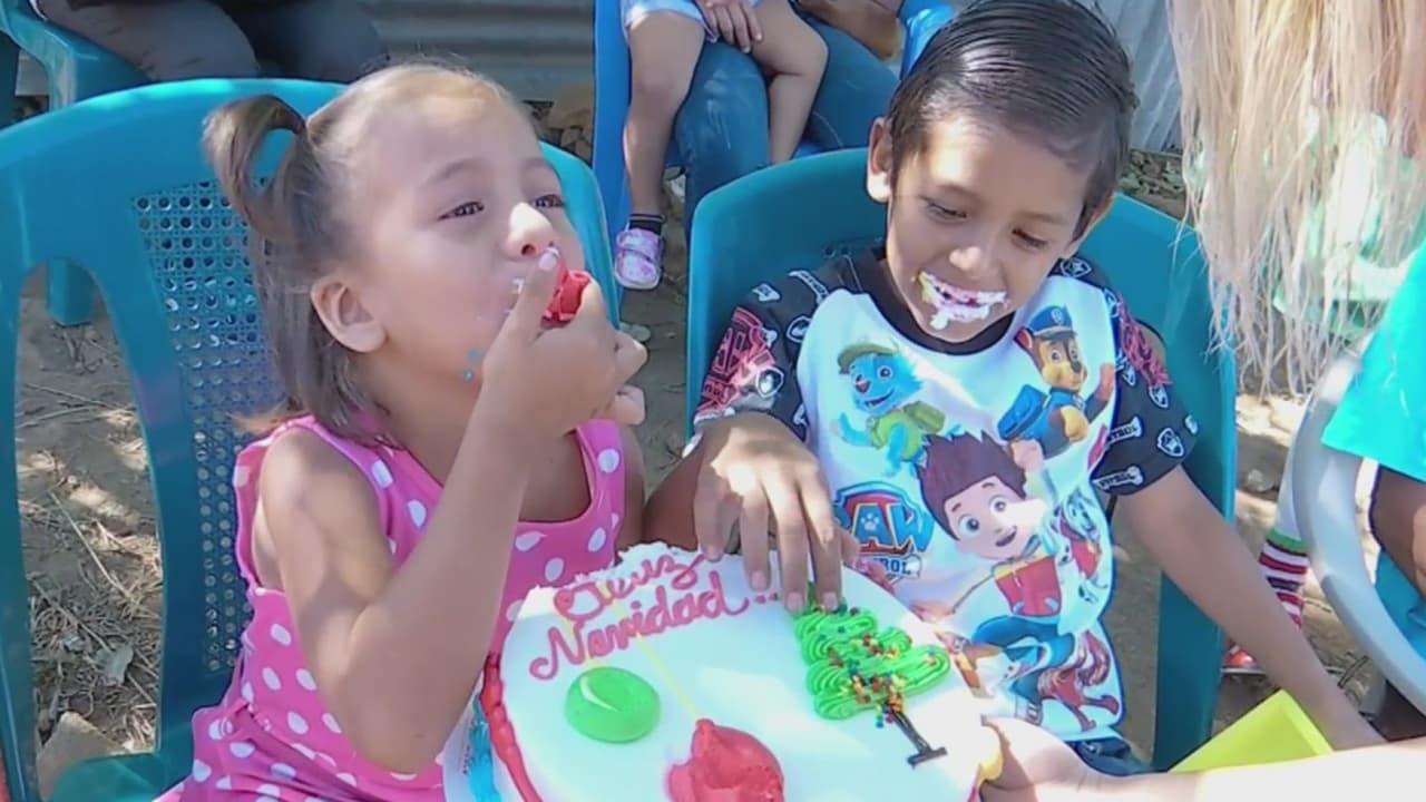 Durante la Nochebuena, los pequeños salvadoreños Andrés y Áslin Díaz recibieron juguetes, dulces, zapatos y hasta el pastel que pidió la niña.
