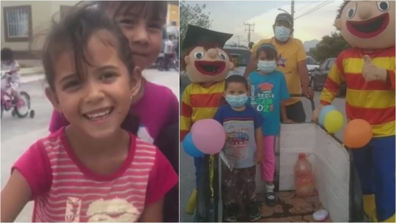 La pequeña manifestó su alegría por el gesto de su abuelo, quien a falta de un auto llenó de globos el triciclo para celebrar en una caravana vehicular su graduación de pre-escolar en México.
