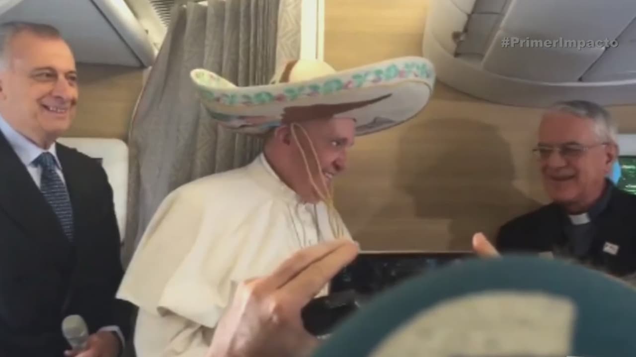 Desde el avión papal, Francisco posó sonriente con su especial obseequio, un sombrero de charro.