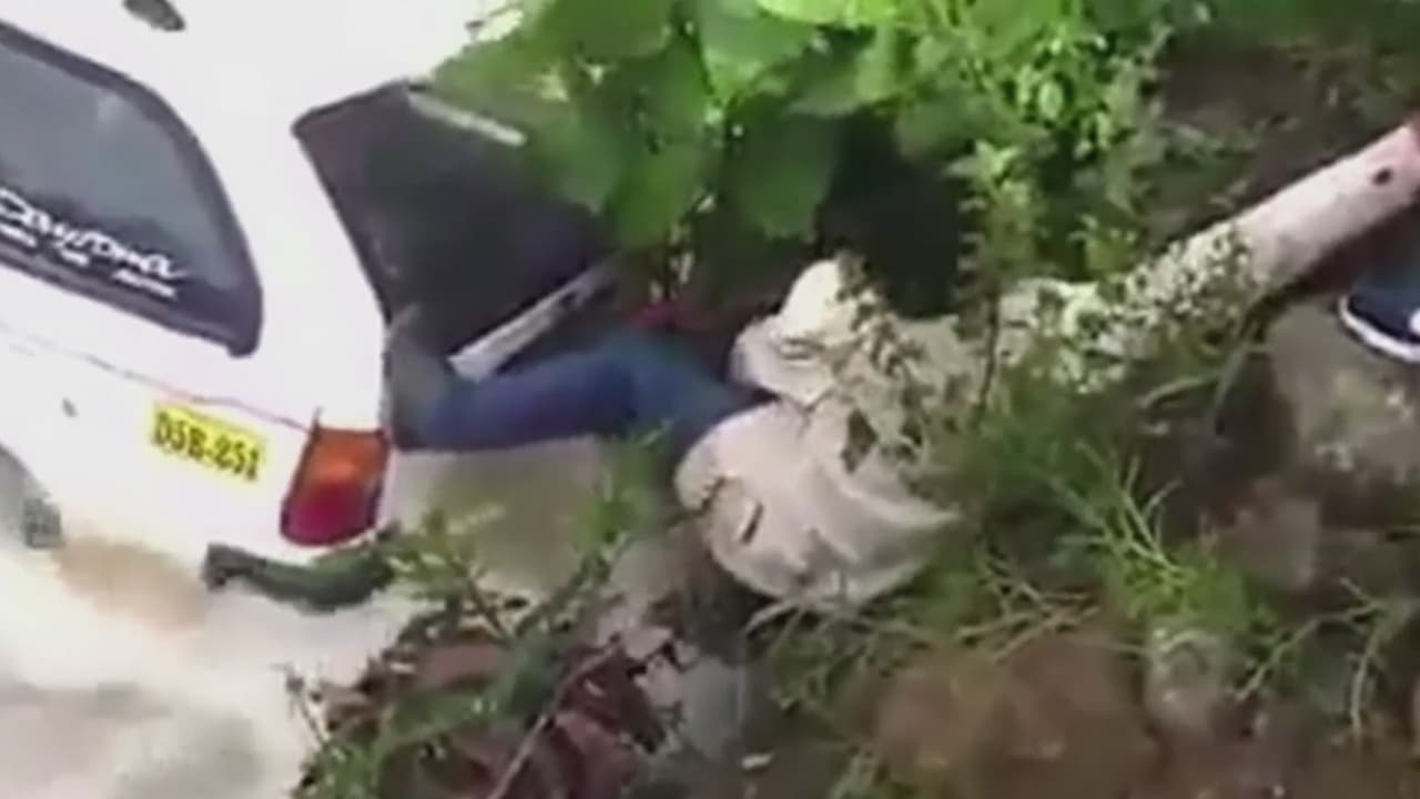 Pasajera, atrapada contra una roca mientras el agua arrastraba su auto en Perú