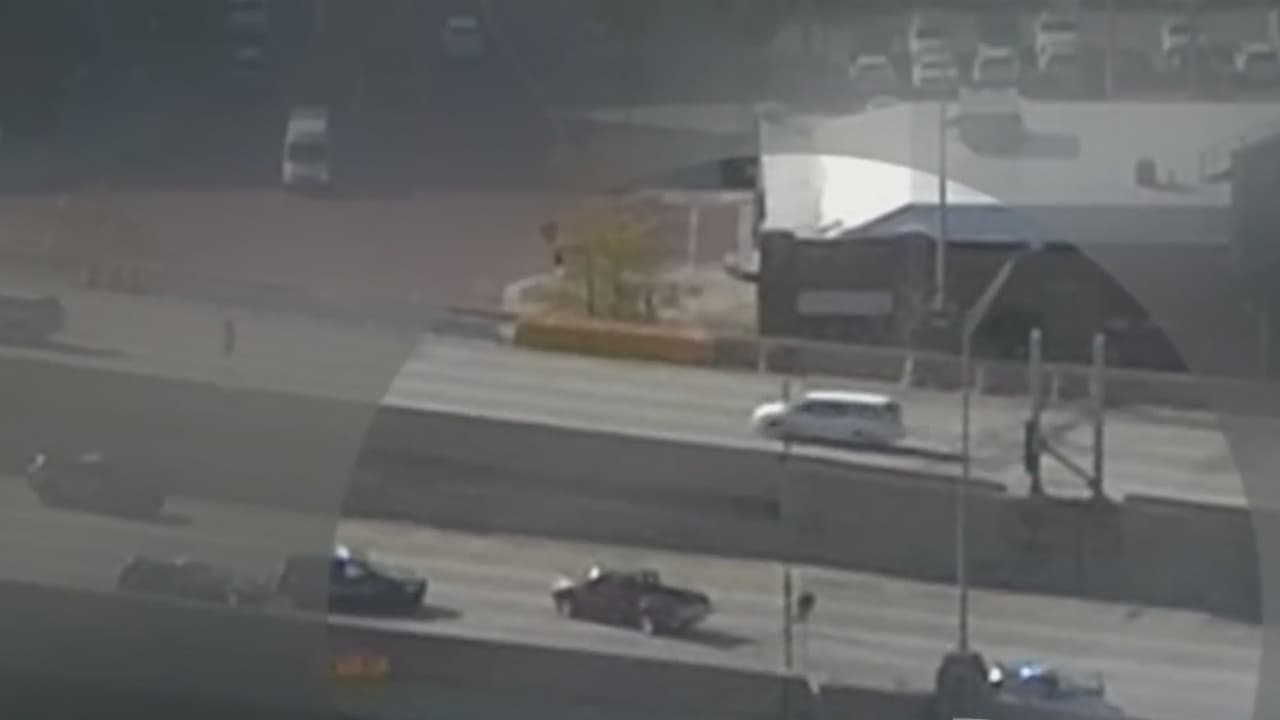 El sujeto huía corriendo por una autopista mientras el auto policial le seguía de cerca. Uno de los oficiales lo atropelló.